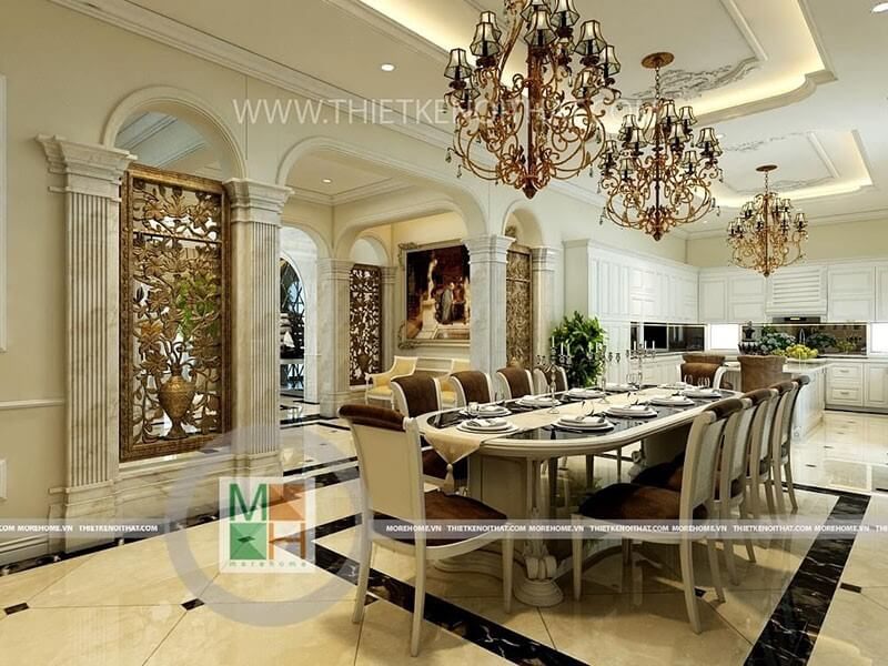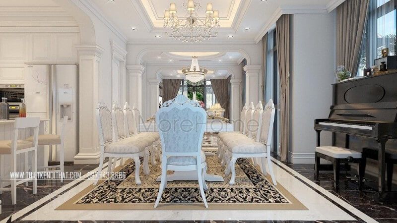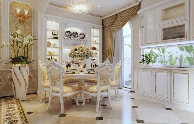 Lựa chọn lối thiết kế tân cổ điển tinh tế, tỉ mỉ, bàn ăn tân cổ điển với những đường cong chạm trổ khéo léo để lại cho bất kì ai nhìn vào một không gian dùng bữa ấm áp mà đẳng cấp hơn cả