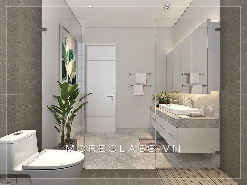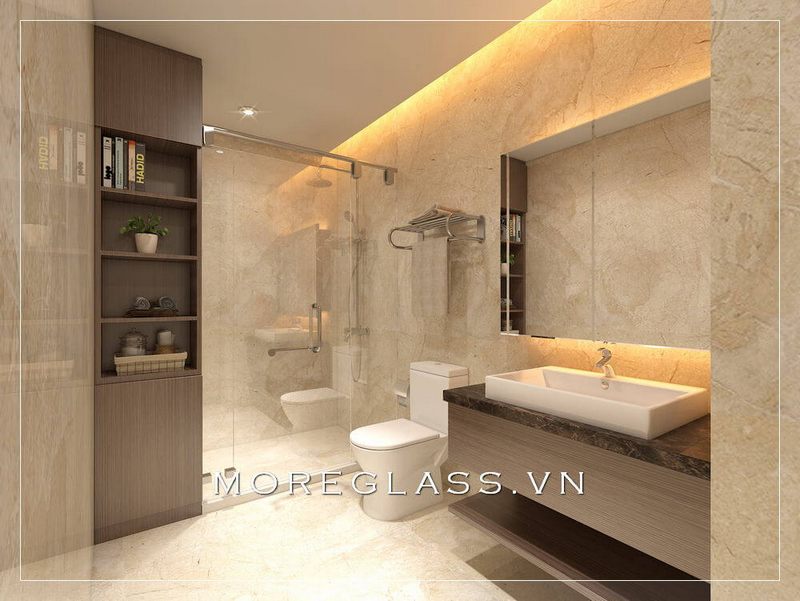 Mẫu thiết kế của nhà tắm và nhà vệ sinh sử dụng kính cường lực để tạo nên vẻ đẹp tinh tế và sang trọng.