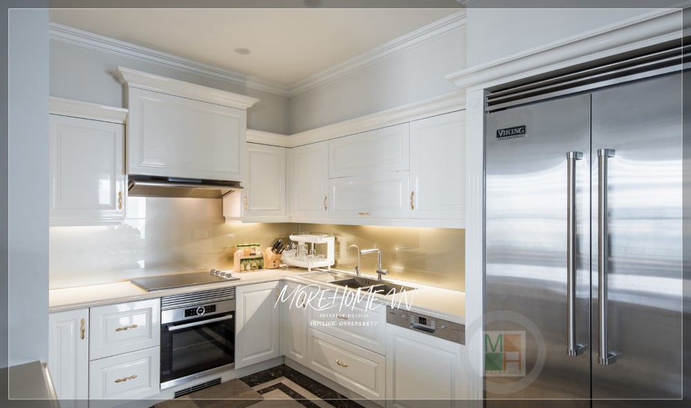 Tủ bếp có màu trắng nhẹ nhàng nhưng vẫn có vẻ sang trọng.